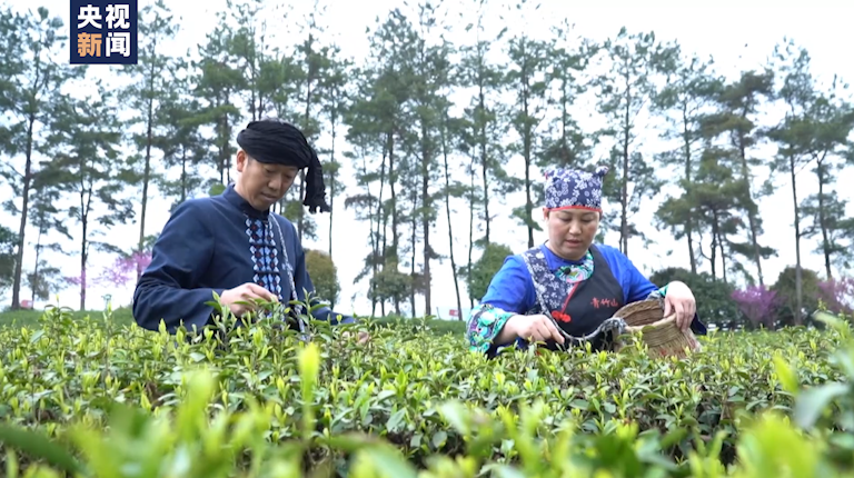 湖南湘西古丈縣境內(nèi)山巒起伏,小河、溪溝眾多,自然凈化條件優(yōu)越,常年云霧繚繞,土壤有機(jī)質(zhì)豐富,是適宜茶樹生長(zhǎng)且擁有悠久種茶歷史的區(qū)域。隨著氣溫的不斷回升,大地吐綠,茶葉逐漸吐露出嫩芽。在湘西土家族苗族自治州古丈縣默戎鎮(zhèn)盤草村的3000余畝的茶園里,鮮綠的茶樹迎風(fēng)搖曳,嫩綠的新芽迎風(fēng)而立,茶農(nóng)們穿梭在茶樹間,一邊唱歌一邊不停地采摘茶葉。